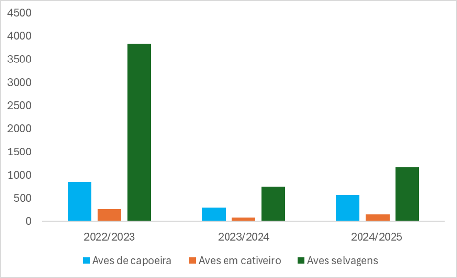 No entanto registou-se, na época de 2024/2025, um aumento do número de focos reportados na Europa, em todos os tipos de aves. O gráfico abaixo compara o nº de focos reportados ao ADIS nas três últimas épocas: