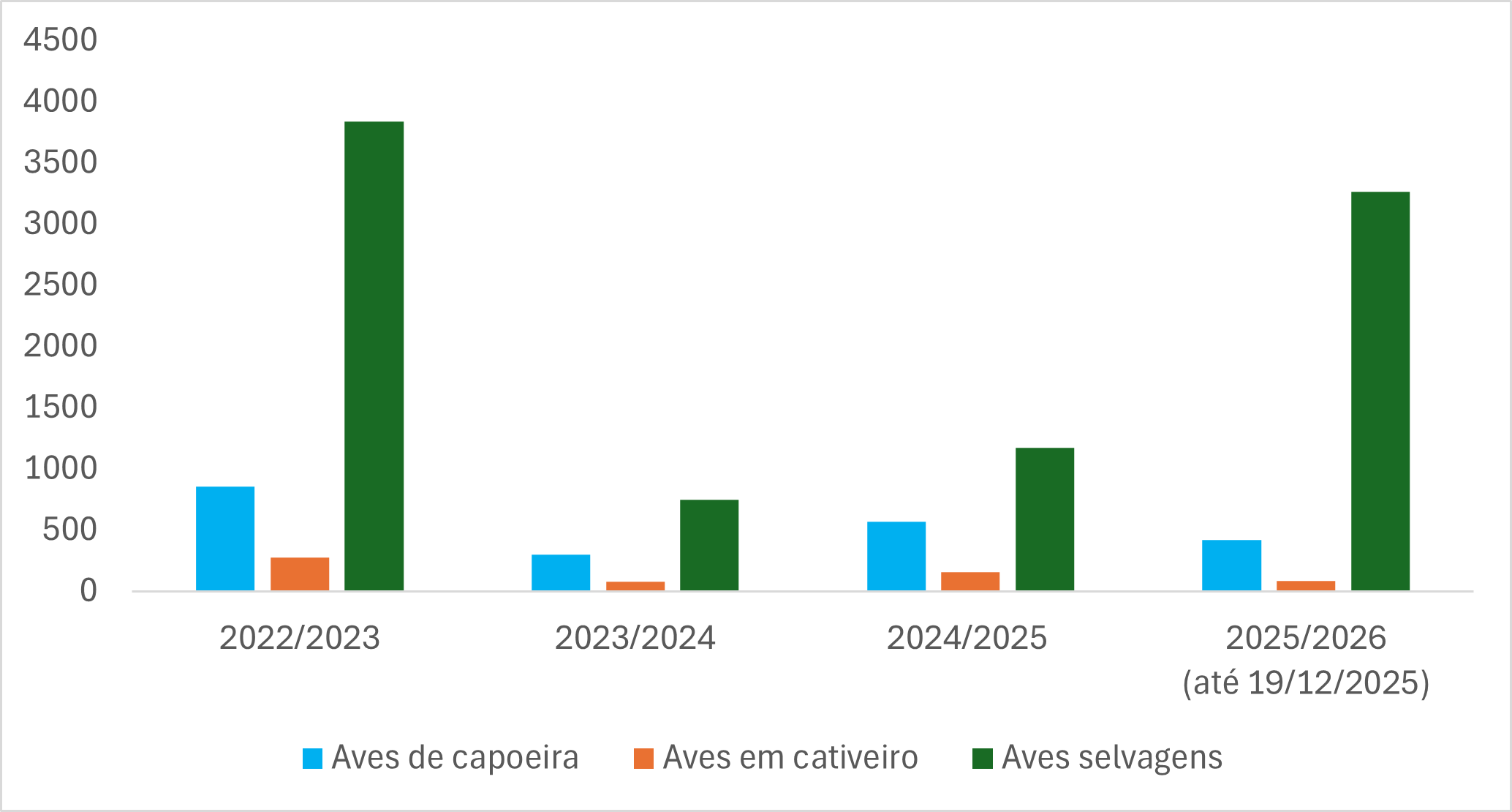 No entanto registou-se, na época de 2024/2025, um aumento do número de focos reportados na Europa, em todos os tipos de aves. A partir de outubro de 2025 este aumento acentuou-se, especialmente nas aves selvagens. O gráfico abaixo compara o nº de focos reportados ao ADIS nas três últimas épocas e na época de 2025/2026, até 19/12/2025: