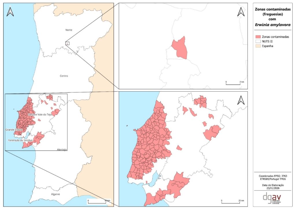A DGAV procede à divulgação do Despacho n.º 26/G/2026 – Atualização das Zonas Contaminadas − Erwinia amylovora (Fogo bacteriano) e Edital 1/2026/Ea/LVT/N – Notificação da Aplicação de Medidas Fitossanitárias – Zonas Contaminadas com Erwinia amylovora.