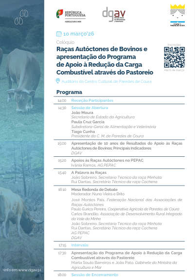 Vai realizar-se amanhã, dia 10 de março, no Auditório do Centro Cultural de Paredes de Coura, o Colóquio subordinado ao tema «Raças Autóctones de Bovinos e apresentação do Programa de Apoio à Redução da Carga Combustível através do Pastoreio», organizado pela DGAV, com o apoio logístico da Câmara Municipal de Paredes de Coura.