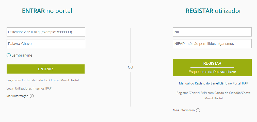 • Registe-se diretamente no portal do IFAP (www.ifap.pt) , selecionando a opção ENTRAR/REGISTAR