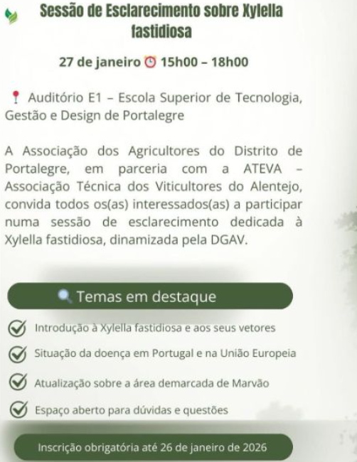 A Associação dos Agricultores do Distrito de Portalegre em parceria com a ATEVA – Associação Técnica dos Viticultores do Alentejo, vão realizar uma Sessão de Esclarecimento sobre Xylella fastidiosa, dinamizada pela DGAV, com a participação da Eng.ª Paula Garcia, Subdiretora Geral da DGAV, no próximo dia 27 de janeiro, entre as 15h00 e as 18h00, no Auditório E1 da Escola Superior de Tecnologia, Gestão e Design de Portalegre.