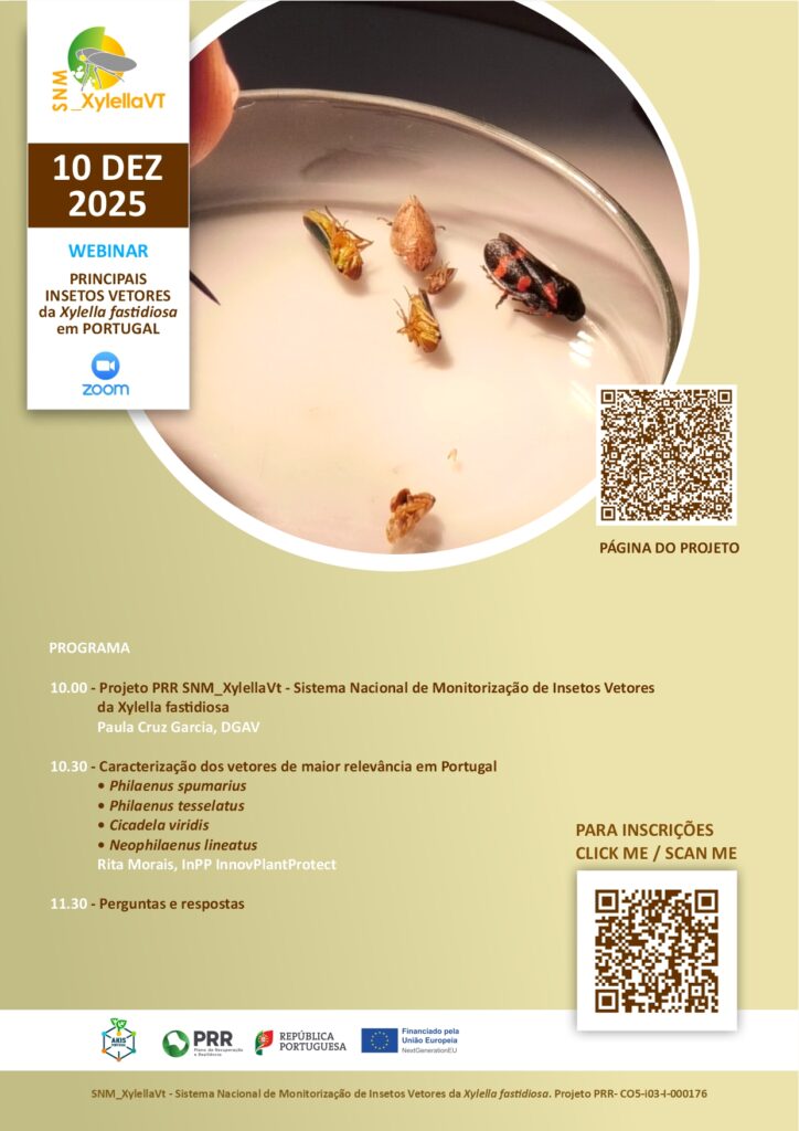 No próximo dia 10 de dezembro, às 10h00, realiza-se a sessão online do projeto PRR SNM_XylellaVt – Sistema Nacional de Monitorização de Insetos Vetores da Xylella fastidiosa, dedicada aos principais insetos vetores da Xylella fastidiosa em Portugal.