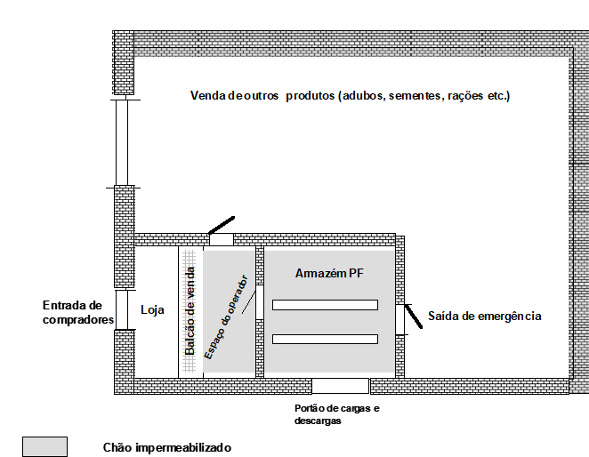 Os produtos fitofarmacêuticos apenas podem ser armazenados e vendidos em instalações exclusivamente destinadas a estes produtos e devidamente autorizadas (ver resposta R1). Exigência que é indispensável satisfazer uma vez que estes produtos são perigosos para o Homem, animais e ambiente, devendo, por este facto, estar isolados dos restantes produtos, tanto no armazenamento como na venda, reforçando a exigência de um balcão exclusivo para este fim. Assim, poderá observar um exemplo, na Parte A, do Anexo I, da Lei n.º 26/2013, onde os clientes entram e saem diretamente para o exterior com acesso vedado a outras instalações. A porta de cargas e descargas deve estar orientada para o exterior do armazém e deve existir um balcão de venda exclusivo de produtos fitofarmacêuticos junto ao armazém (para mais informações consulte a resposta R3).