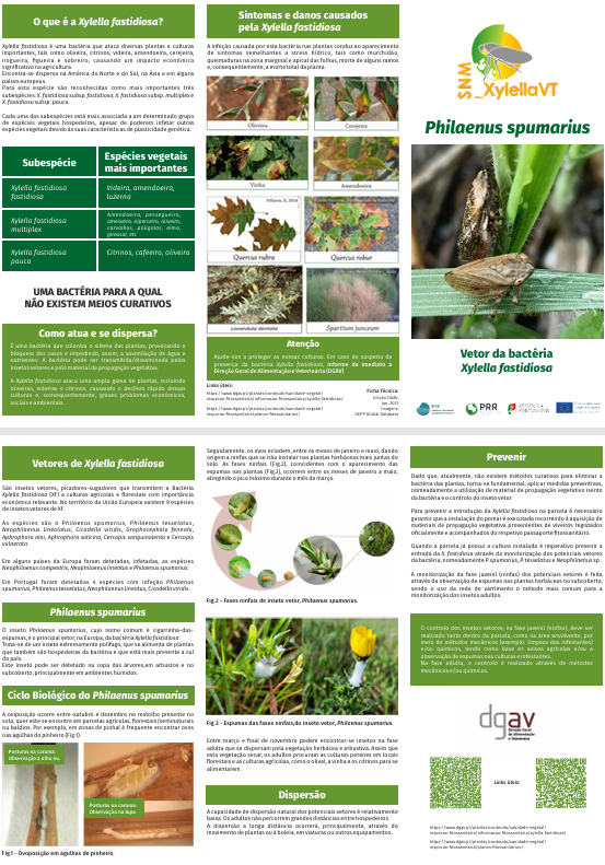 O projeto SNM_XylellaVt, financiado no âmbito do Plano de Recuperação e Resiliência (PRR), teve como objetivo central a criação de uma rede nacional dedicada à monitorização dos insetos vetores da bactéria Xylella fastidiosa — com destaque para Philaenus spumarius. Paralelamente, o projeto desenvolveu ferramentas de previsão de risco e sistemas de alerta destinados a apoiar as autoridades fitossanitárias e os diversos agentes do setor agrícola.